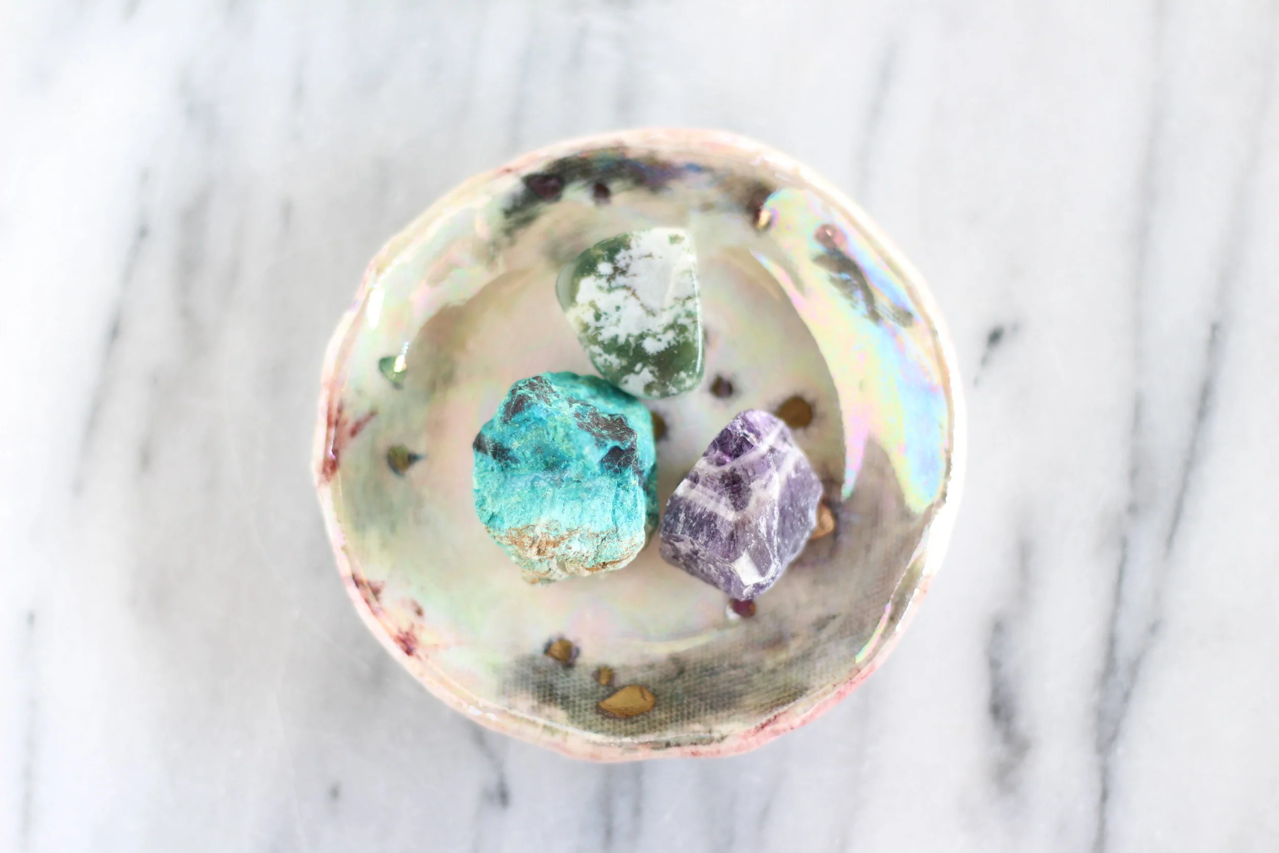 “Crafted of translucent porcelain clay, each piece contains 22k gold accents and a hand-painted mother of pearl luster.”